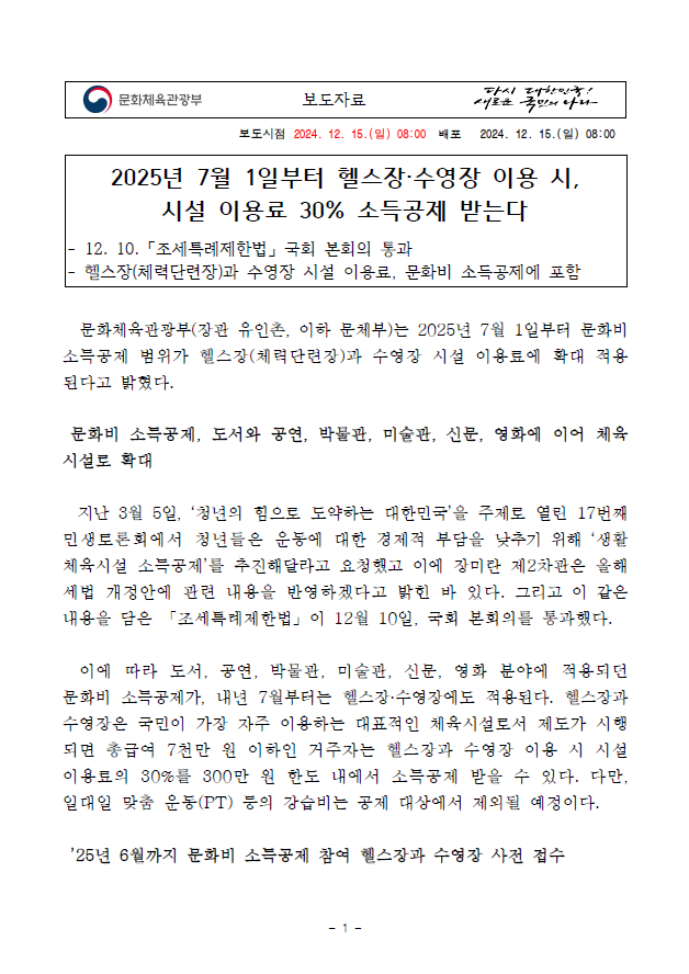 보도자료 - 2025년 7월 1일부터 헬스장·수영장 이용 시, 시설 이용료 30% 소득공제 받는다 | 문화체