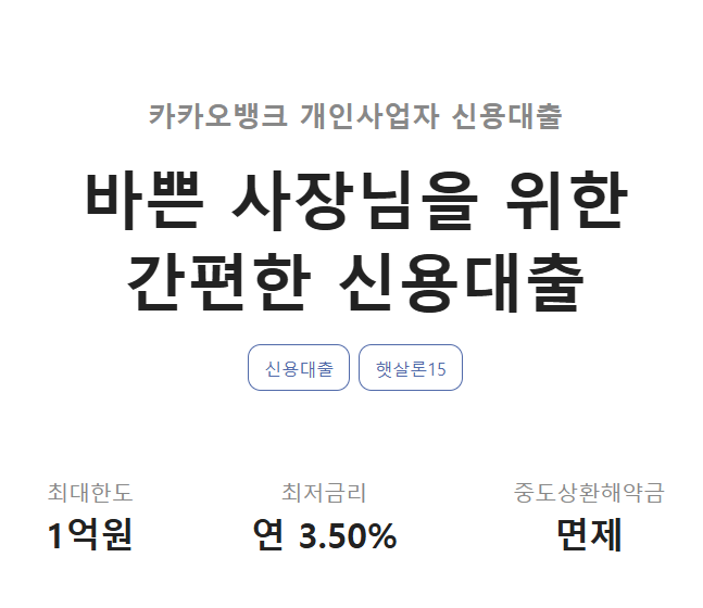 - 카카오뱅크 개인사업자 대출: 사업자등록증을 보유한 개인사업자를 대상으로 최대 2,000만 원까지 지원하며, 금리는 최저 연 3.25%부터 시작해요. (더알아보기)