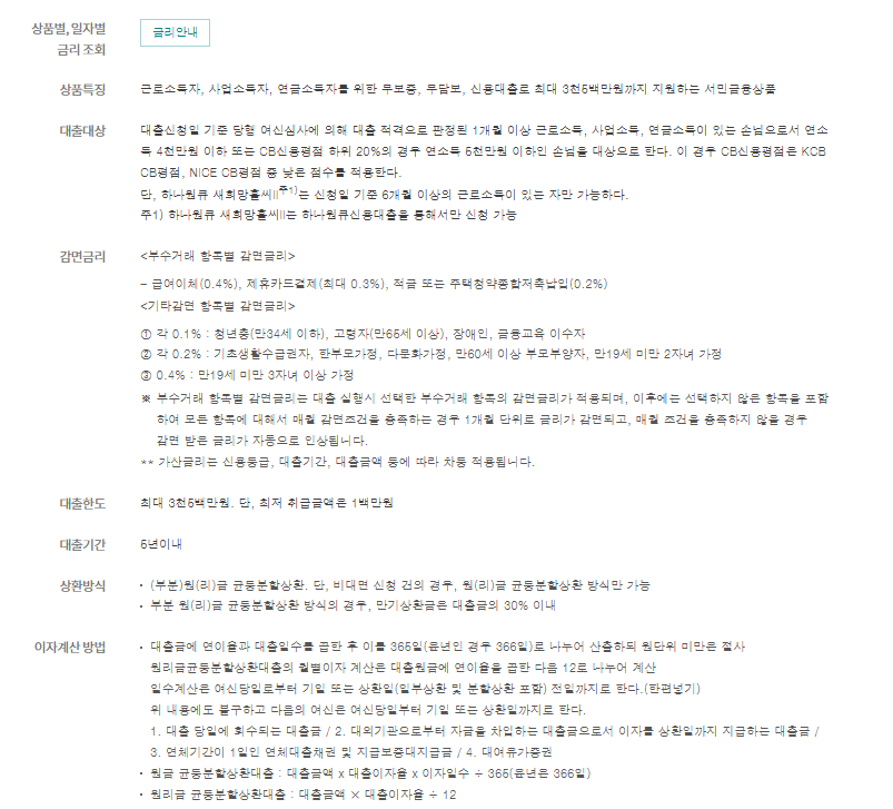 - 새희망홀씨 대출: 연소득 4,000만 원 이하 또는 신용점수가 낮은 분들을 대상으로 최대 3,500만 원까지 지원해요. 금리는 연 10.5% 이내로, 상환 기간은 최대 10년까지 가능해요. (더알아보기)