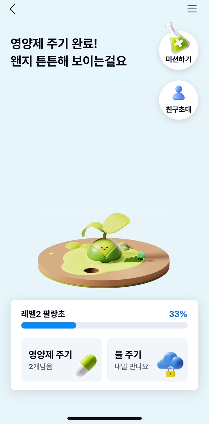 ✔️ 영양제 주기: 미션을 완료하거나 친구 초대로 영양제를 얻어주세요.
