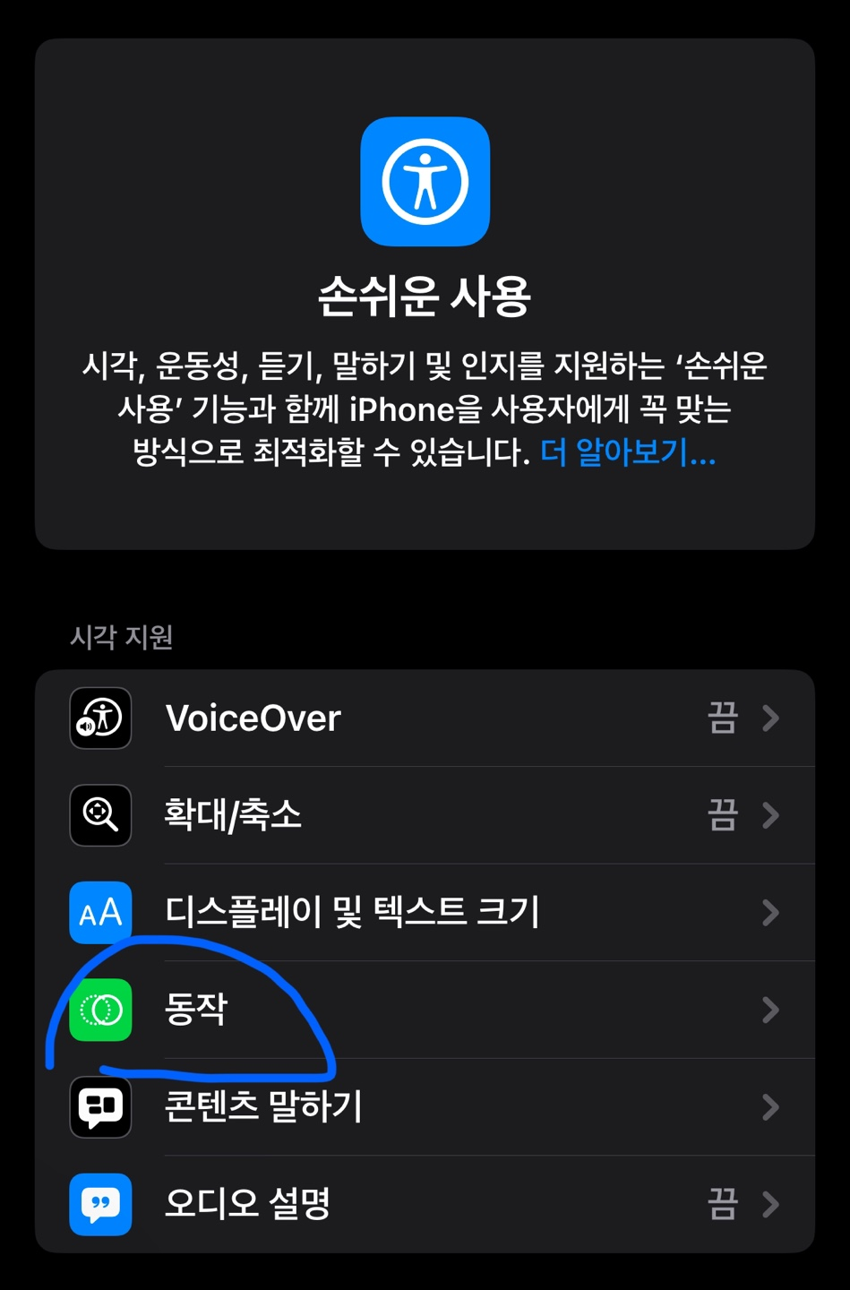 - 손쉬운 사용 > 동작 > 차량 모션큐 보기 선택