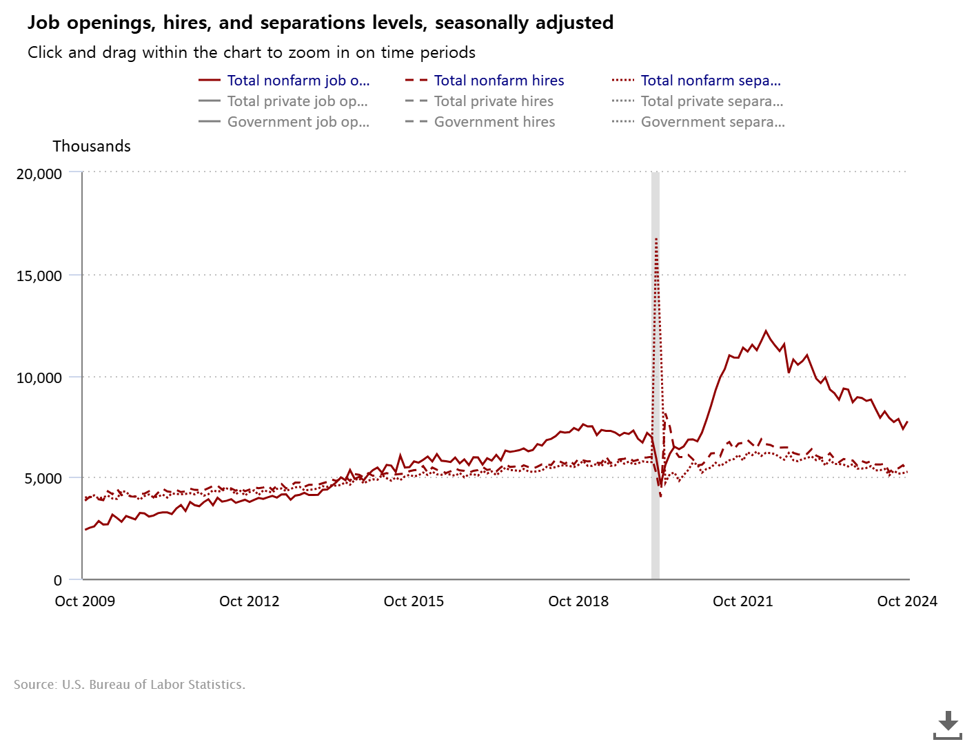 JOLTS 보고서는 미국 전역의 고용주로부터 수집한 데이터를 기반으로, 구인건수(Job Openings), 이직(Turnover), 퇴직(Quit) 등의 정보를 담고 있어요.