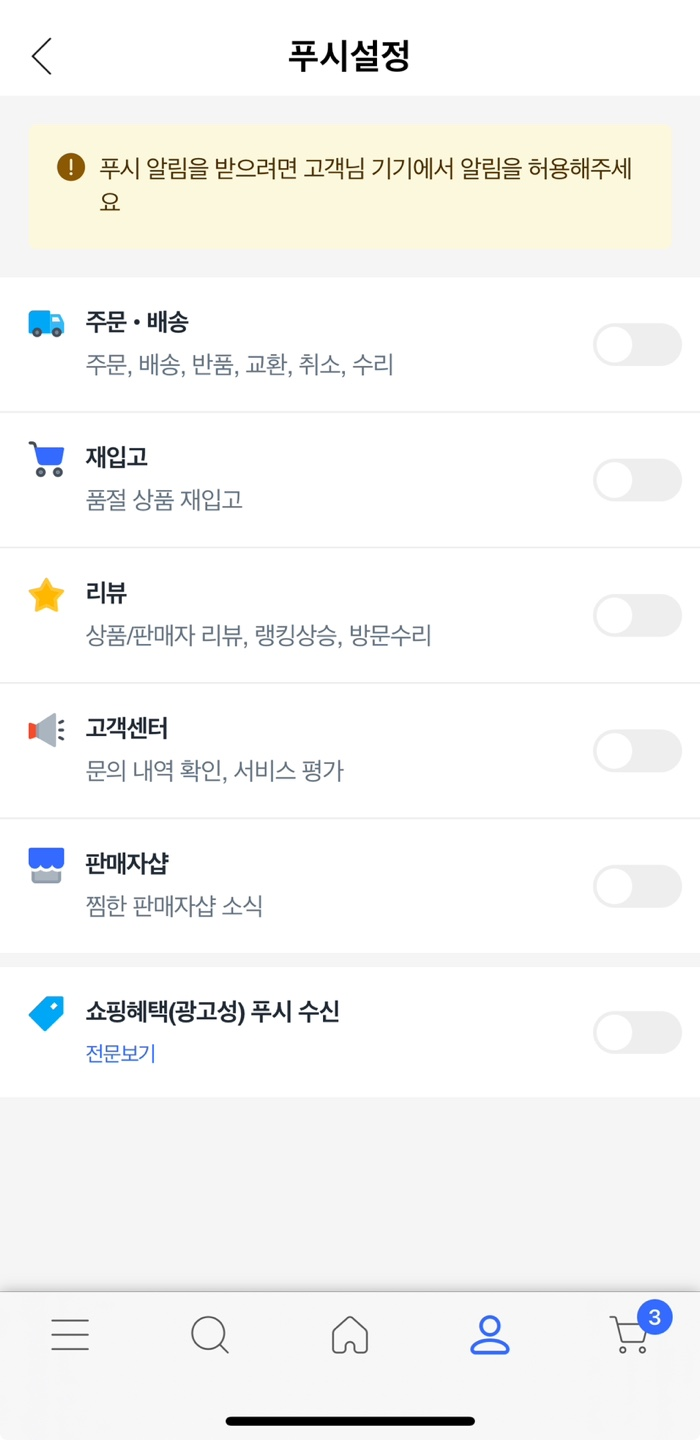 - ❌ 쇼핑 혜택 알림(쿠폰, 할인): 비활성화