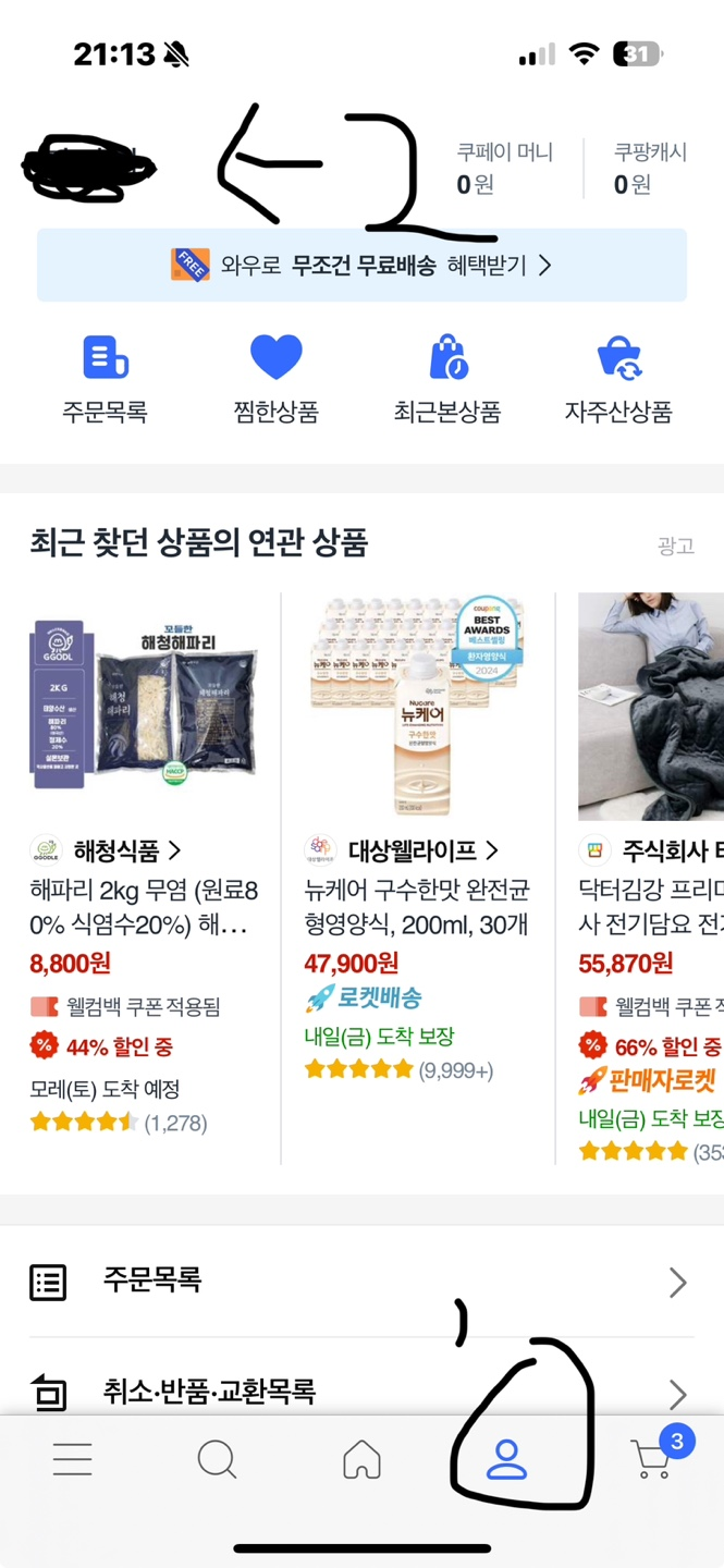 ➡️ 경로: [마이쿠팡] → [내 이름]